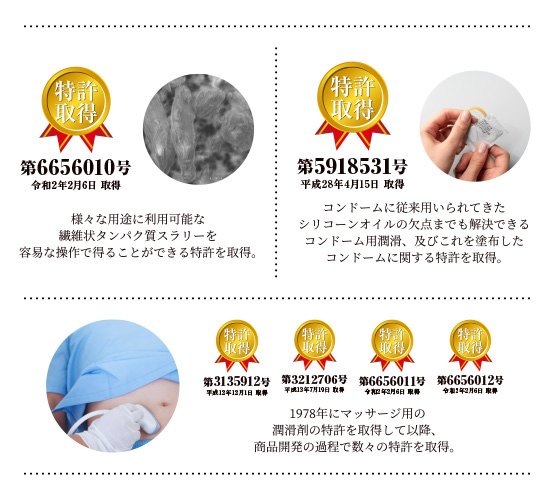 医療現場でも大活躍1978年にマッサージ用の潤滑剤の特許を取得して以降、商品開発の過程で数々の特許を取得。2021年にはペペローションの主成分の消臭効果で特許を取得。高い技術力と製品開発への真摯な想いが信頼に繋がり、 関連商品にはエコー検査やカテーテル挿入時の潤滑剤として、医療現場でも活躍している製品もあります。